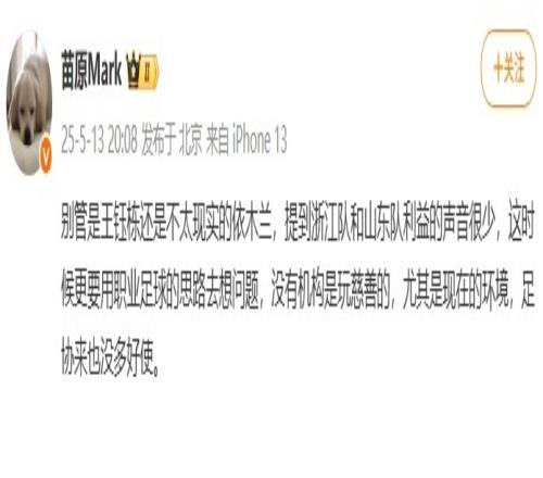 “别管是王钰栋还是不太现实的依木兰,提到浙江队和山东队利益的声音很少,这时候更要用职业足球的思路去想问题,没有机构是玩慈善的,尤其是现在的环境,足协来也没多好使。 ”