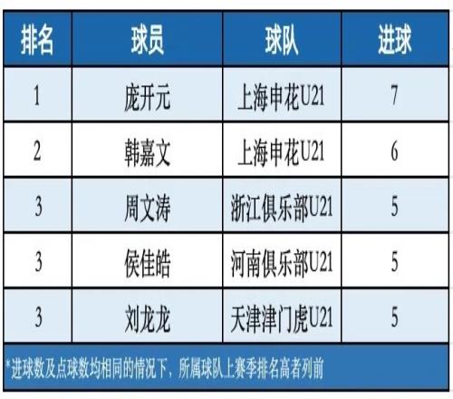 U21联赛积分榜:西海岸津门虎分居小组首位庞开元7球领跑射手榜
