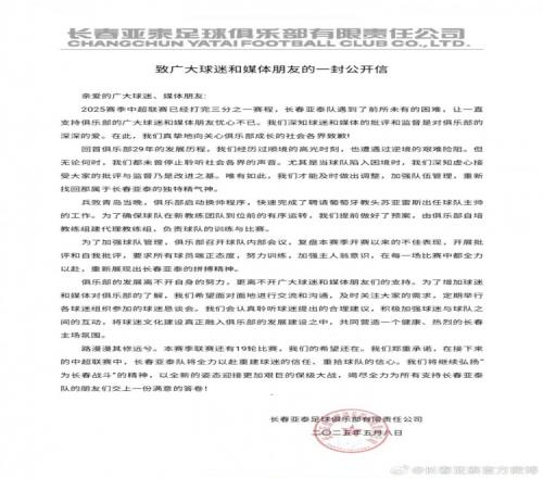 体育资讯5月8日报道宣称 今天,长春亚泰俱乐部发布了致广大球迷和媒体朋友的一封公开信 。