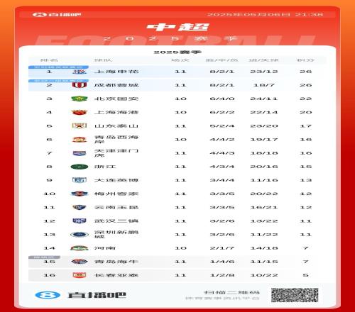 5月6日,中超第11轮结束争夺,申花客场3-1击败梅州客家,积分追平蓉城,以净胜球优势重返榜首。本轮比赛,中超排名前四的球队全部赢球,第五的山东泰山客场2-3被云南玉昆逆转,被前四名拉开积分差距,第五的位置也岌岌可危。目前,泰山的积分只有17分,排名虽然还是第五位,但距榜首的差距达到9分。