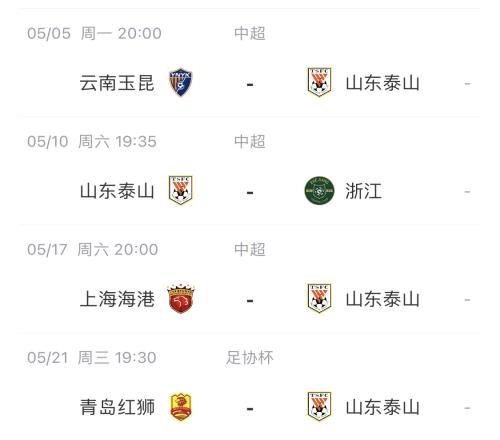 间歇期前,泰山还有3场中超和1场足协杯,联赛分别是客场对阵玉昆、主场对阵浙江、客场对阵海港。都是排名中上游的球队,其中玉昆有主场和高原之利,对于体能状况一般的泰山而言挑战并不小;主场和浙江的比赛,对手是仅次于争冠五强的球队;至于客场和海港的比赛,重要性无需赘言。足协杯比赛,泰山是客场对阵青岛红狮,正常来讲难度不算太大,红狮目前在中甲表现也不太好。
