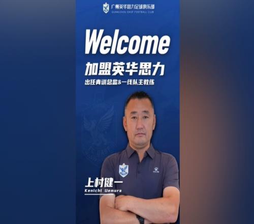 官方:前U17国少主帅上村健一出任广州英华思力一线队主教练