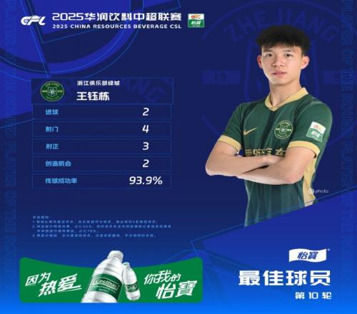 体育资讯5月4日报道宣称 中超联赛今日官方公布了联赛第10轮最佳球员,浙江队小将王钰栋当选。