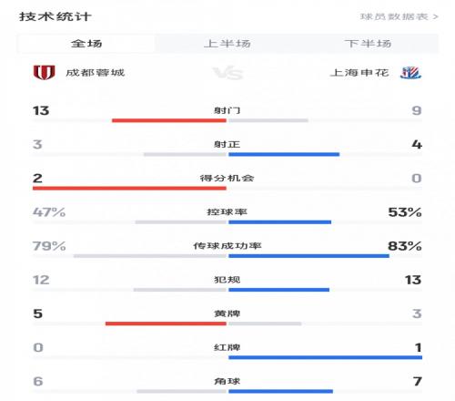蓉城10申花全场数据:蓉城13射3正,蓉城5黄、申花3黄1红