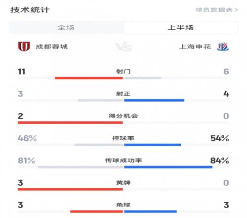 蓉城vs申花半场数据:蓉城11射3正申花6射4正,黄牌3张对0张
