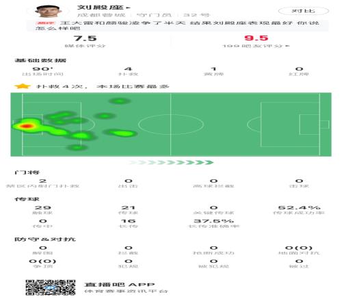 体育资讯05月02日报道宣称 中超第10轮,成都蓉城1-0上海申花,队史首次登顶积分榜榜首。本场比赛,蓉城门将刘殿座表现神勇,贡献4次扑救,在上半场将路易斯近距离的头球攻门扑出力保球门不失。