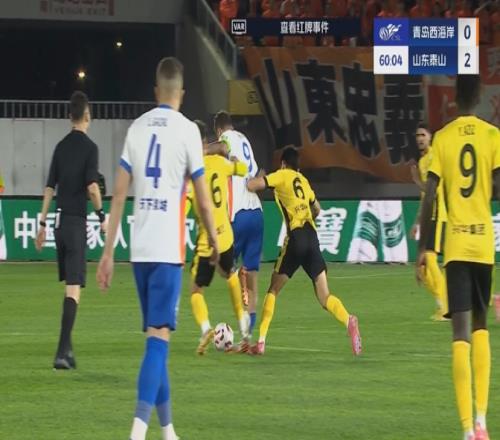 中超第7轮,青岛西海岸VS山东泰山,比赛第60分钟,青岛西海岸56号队员脚部与山东泰山9号队员腿部有接触,裁判员判青岛西海岸56号犯规,无纪律处罚。VAR介入后,裁判员经在场回看,向青岛西海岸56号出示黄牌。