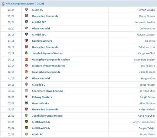 另外大阪钢巴、浦项制铁、城南一和天马、萨德、西悉尼流浪者、鹿岛鹿角各一次夺冠。