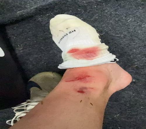 海港客场3-2击败玉昆的比赛中,李帅首发并打满全场。刘闻超晒出李帅脚步伤势照片,脚踝伤口处流出的鲜血已经浸透了球袜,刘闻超配文写道: