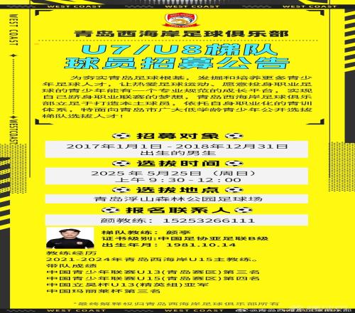 体育资讯04月24日报道宣称 青岛西海岸官方发布公告,公开招募U7/U8梯队小球员,面向青岛市公开选拔。