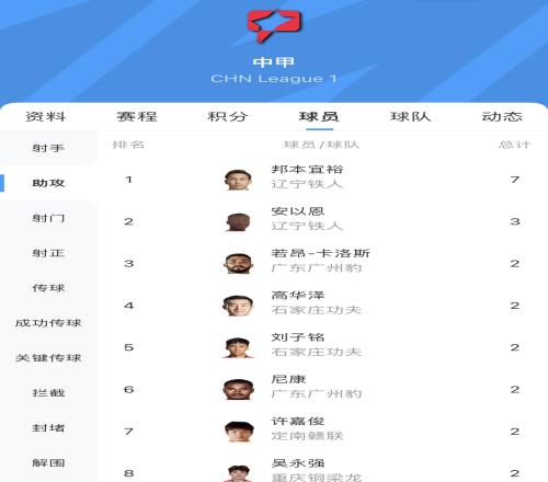 中甲助攻榜:邦本宜裕助攻大四喜5轮7球居首,安以恩3球第二