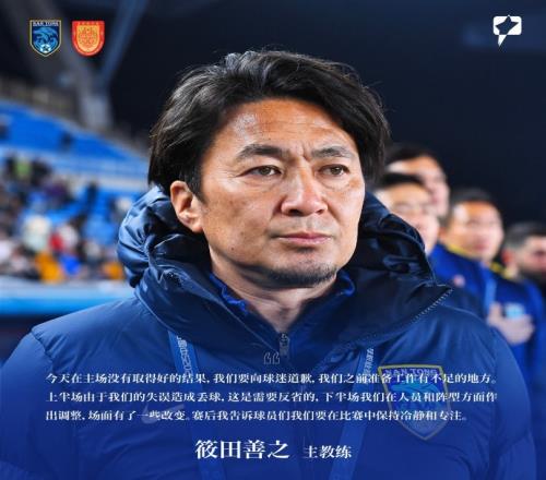 主教练筱田善之:今天在主场没有取得好的结果,我们要向球迷道歉,我们之前准备工作有不足的地方。上半场由于我们的失误造成丢球,这是需要反省的,下半场我们在人员和阵型方面作出调整,场面有了一些改变。赛后我告诉球员们我们要在比赛中保持冷静和专注。