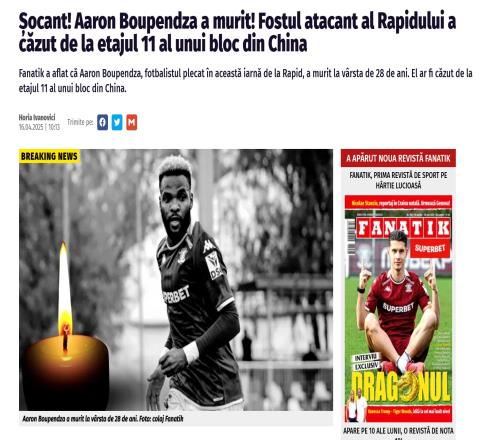 罗马尼亚媒体FANATIK今日发布的消息称,现效力于中超浙江足球俱乐部的前锋布彭扎从一栋11层高楼坠落不幸身亡,年仅28岁。