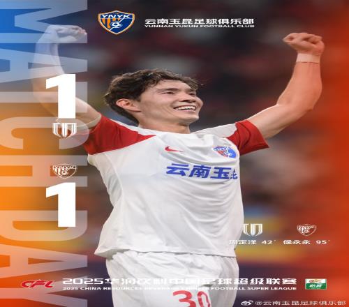 成都蓉城vs云南玉昆 2025华润饮料中超联赛第7轮,客场作战的云南玉昆以1比1战平对手。上半场,对方球员周定洋门前抢射破门,经var认定,进球有效。在下半场落后的情况下,经过人员调整、阵型变化,场上球员拼到了最后一刻,第95分钟,奥斯卡门前一捅,侯永永赶在对方后卫之前,将球打进球门。