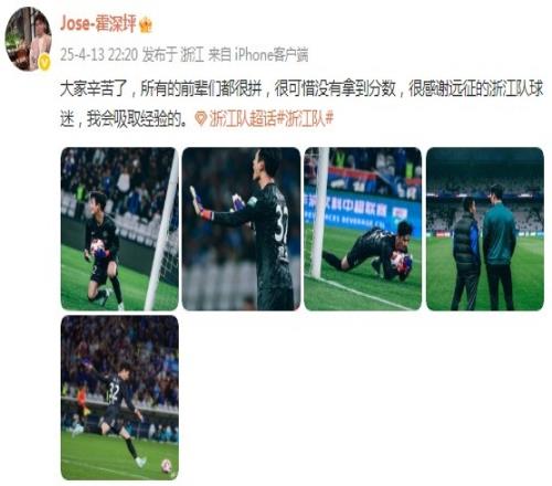 体育资讯4月13日报道宣称 今天,浙江队门将霍深坪更新社媒,就客场对阵申花未能拿分致歉。