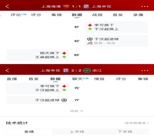 第六轮,申花2-2浙江(最终比分3-2),于汉超75分钟登场,77分钟进球。