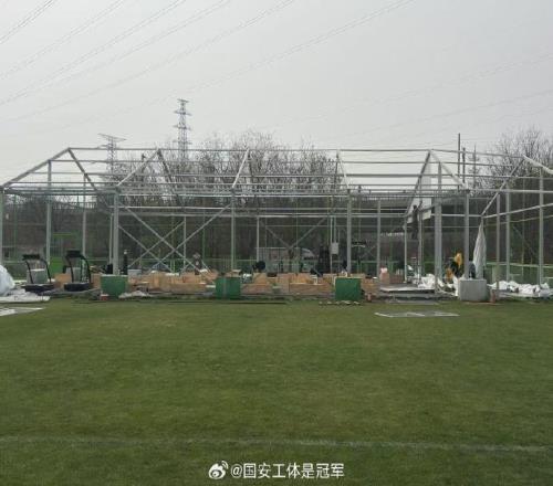 除了工体,一线队日常训练的高鑫基地也积极应对大风天气,篷房除了框架剩下已经全部拆掉了,现在变成了一个露天健身房的感觉。