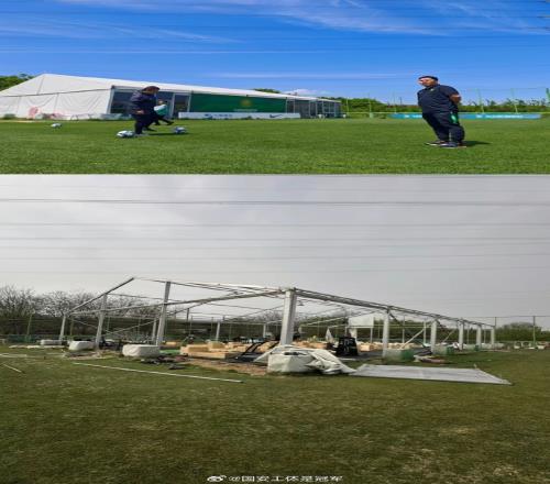 受大风影响!博主谈国安基地应对措施:篷房除框架剩下已全部拆掉