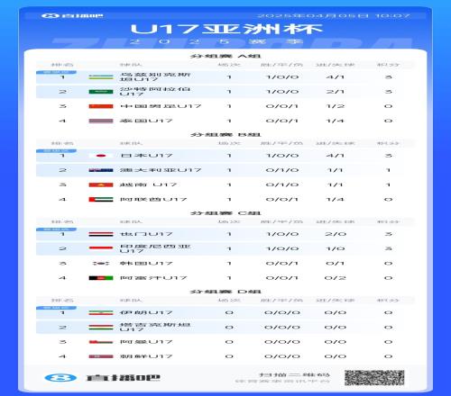 体育资讯4月5日报道宣称 除了中国队所在的A组,U17亚洲杯B组、C组首轮比赛也已战罢,具体赛果如下: