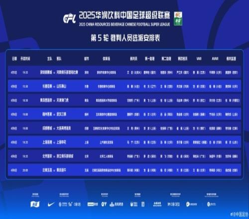 体育资讯4月5日报道宣称 中国足协公布中超第5轮以及中甲第3轮裁判名单,高鹏执法亚泰vs泰山,李海新执法国安vs浙江。