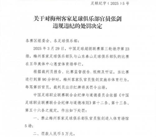 体育资讯4月3日报道宣称 中足联发布处罚决定,梅州客家足球俱乐部官员张剑因辱骂第四官员被禁止入场5场,罚款5万。