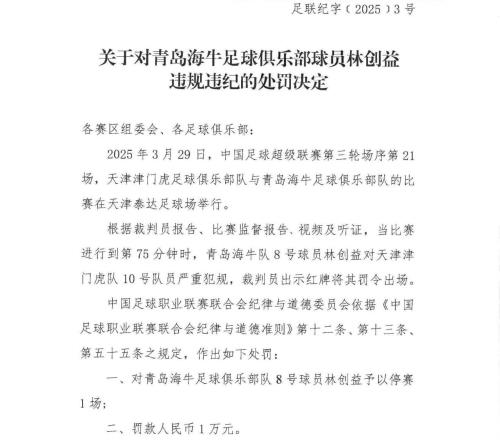 飞铲吃直红!官方:青岛海牛球员林创益停赛1场,罚款1万元