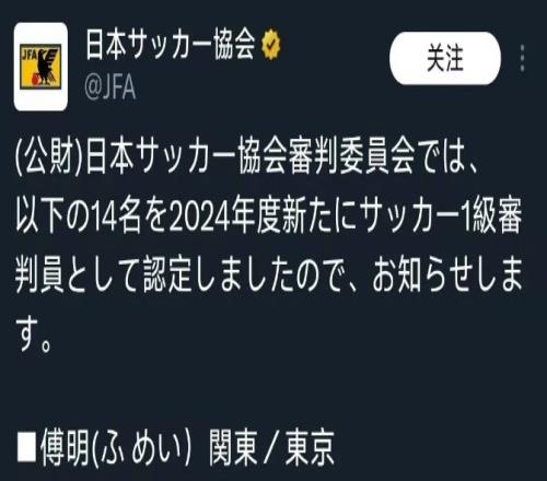 此前,傅明获得了日本足协一级裁判资格,注册协会为东京,可直接参与日本足协组织的足球赛事执裁工作。