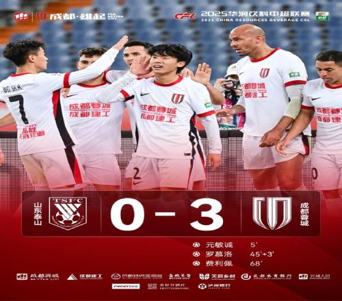 今晚,成都蓉城远征济南奥体中心体育场对阵劲旅山东泰山,最终3-0战胜对手!梦幻开局,开场周定洋献助攻,元敏诚冷静推射破门领先;上半场补时阶段罗慕洛头球补射破门扩大比分!半场比分来到2-0。下半场费利佩把握机会打入一球,3-0!蓉城将士们齐心协力,将领先比分保持到比赛最后一分钟。连续客战强敌,蓉城将士们带着4分回家!