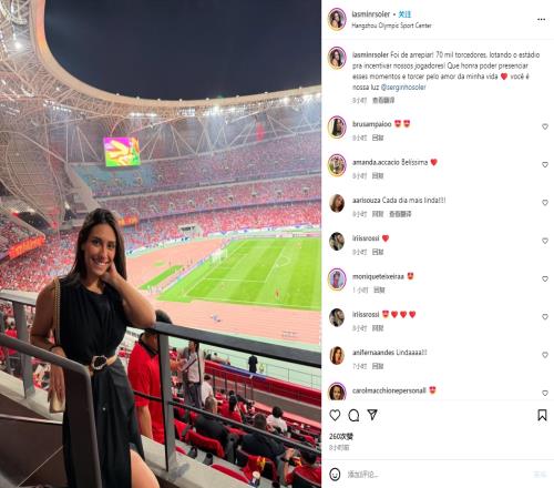 体育资讯3月26日报道宣称 国足主场与澳大利亚的比赛结束后,塞尔吉尼奥的妻子更新社媒,晒出了自己在现场观赛的感受。