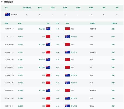 据中国足协官网数据显示,国足此前共11次交手澳大利亚,取得4胜2平5负的战绩。