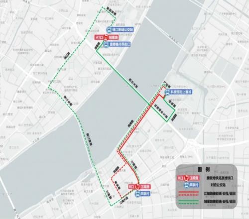 2.公交接驳:在飞虹路科技馆街交叉口设置2条公交接驳专线将观众分别送至地铁1号线江陵路站、地铁4号线城星路站。
