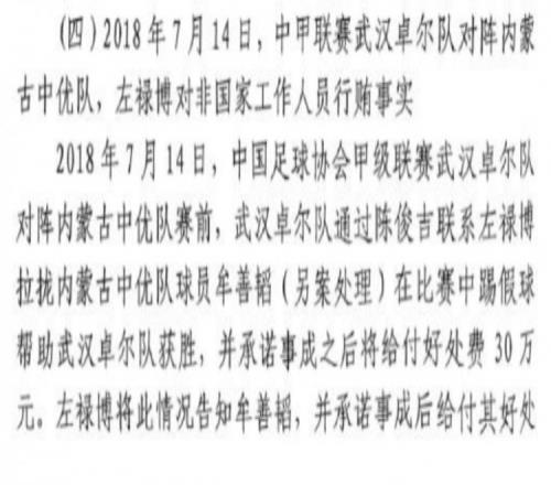 2018年7月14日,中国足球协会甲级联赛武汉卓尔队对阵内蒙古中优队赛前,武汉卓尔队通过陈俊吉联系左禄博拉拢内蒙古中优队球员牟善韬(另案处理)在比赛中踢假球帮助武汉卓尔队获胜,并承诺事成之后将给付好处费30万元。