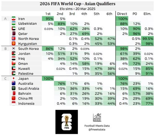 外媒Football Meets Data更新了世预赛亚洲区最新的晋级概率,其中国足以小组第二直接晋级世界杯的概率为2%,位列小组前四晋级附加赛的概率为29%,而直接淘汰的概率高达69%,但仍领先于印尼。