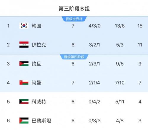 1-1战平阿曼后,韩国积15分继续位居榜首,阿曼7分仍然位居第4。如果北京时间明天凌晨伊拉克能战胜科威特,与榜首韩国队之间的差距就将缩小至1分。