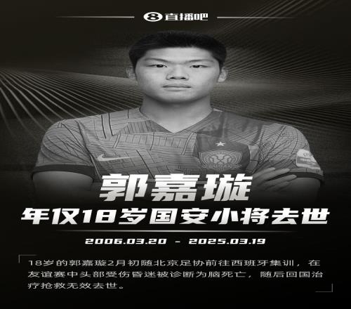 2025年3月19日晚,北京国安青训球员郭嘉璇不幸离世。作为一名优秀的青年球员,嘉璇对足球事业充满热爱。绿茵场上,他奋力拼搏、追逐梦想,深深感染着每一个关心和爱护他的人!对嘉璇的离世,我们深感痛心、无比惋惜!