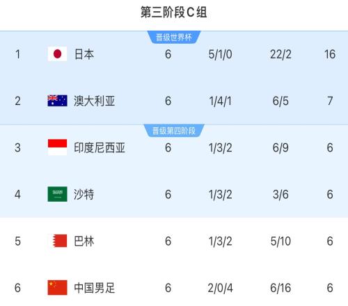 目前在18强赛C组积分榜,国足积6分暂居最后一位,不过与排在第二位的澳大利亚仅仅差1分,沙特则同积6分排在第4位。