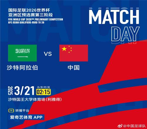 北京时间3月21日凌晨02:15,国际足联2026世界杯亚洲区预选赛第七轮-中国国家男子足球队将在利雅得沙特国王大学体育场对阵沙特阿拉伯国家男子足球队。锁定以下转播平台,一起为中国队加油!