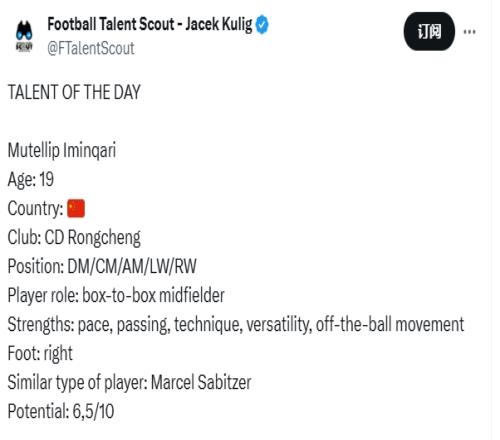 体育资讯03月19日报道宣称 王钰栋昨日登上全球球探网站Football Talent Scout“今日天才”板块,据博主“朗尼克”介绍,这是过去十年间第二个登上这个网站的中国球员。比王钰栋更早登上Football Talent Scout的是蓉城青训出身的木塔力甫。