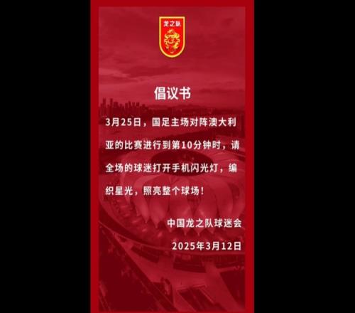 龙之队倡议:国足vs澳大利亚第10分钟,全场球迷打开手机闪光灯
