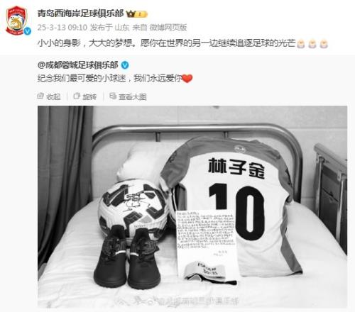 得知林子金去世的消息后,青岛西海岸俱乐部官博转发了成都蓉城俱乐部的讣告并配文悼念写道:“小小的身影,大大的梦想。愿你在世界的另一边继续追逐足球的光芒。”