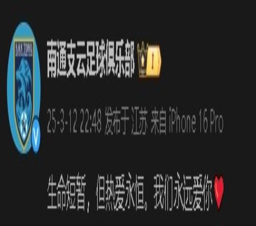 南通支云俱乐部社媒发文悼念:生命短暂,但热爱永恒。我们永远爱你❤️