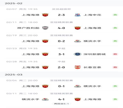 2025年海港超级杯2-3遭申花逆转,亚冠4场全败,联赛则取得了两连胜。