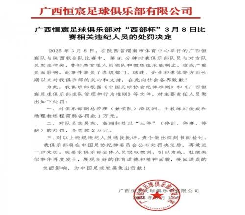 广西恒宸官方:西部杯冲突两相关球员三停罚2万,主帅等三人罚1万