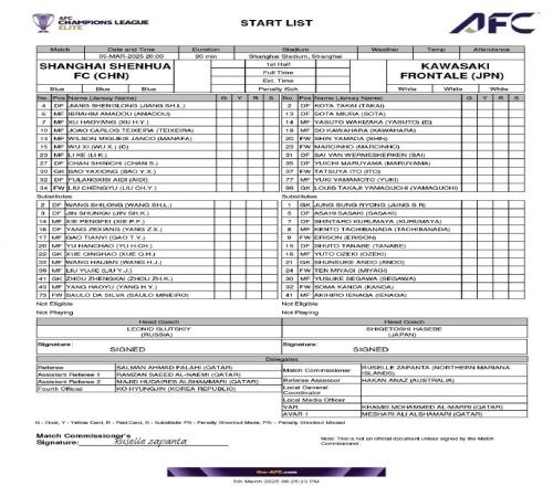 2024/25亚冠精英联赛1/8决赛首回合 上海申花vs川崎前锋 首发名单