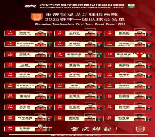 重庆铜梁龙2025赛季一线队名单:平均23.7岁,重庆球员占比29.6%