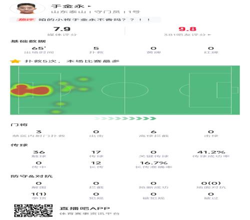 体育资讯02月23日报道宣称 中超第1轮,山东泰山主场0-0战平河南队,在首发门将王大雷第23分钟就被红牌罚下的情况下,20岁的替补门将于金永临危救主,全场贡献5次扑救,力保球门不失。