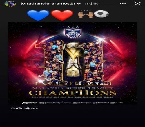 24日进行的马来西亚超级联赛第22轮比赛,柔佛新山主场2-0击败霹雳,提前4轮问鼎本赛季冠军。赛后,比埃拉晒出了夺冠的海报,并附上了多个表情庆祝柔佛新山提前夺冠。