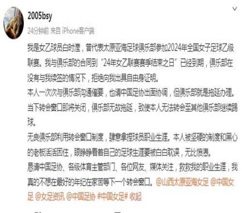 体育资讯2月26日报道宣称 女乙球员白时滢在社媒透露,山西太原亚海足球俱乐部在其合同到期的情况下,拒绝出具自由身证明。