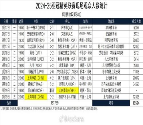 2024-25亚冠精英联赛现场观众人数统计(联赛阶段第8轮)