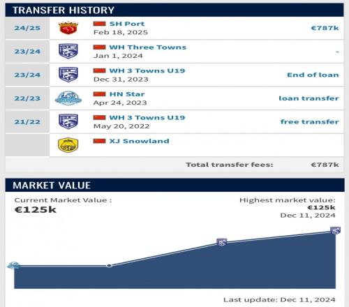 在吾米提江的个人页面显示,他已于2月18日加盟上海海港,转会费78.7万欧元(约合600万人民币),不过合同年限暂未披露。目前,吾米提江的个人身价为12.5万欧元。